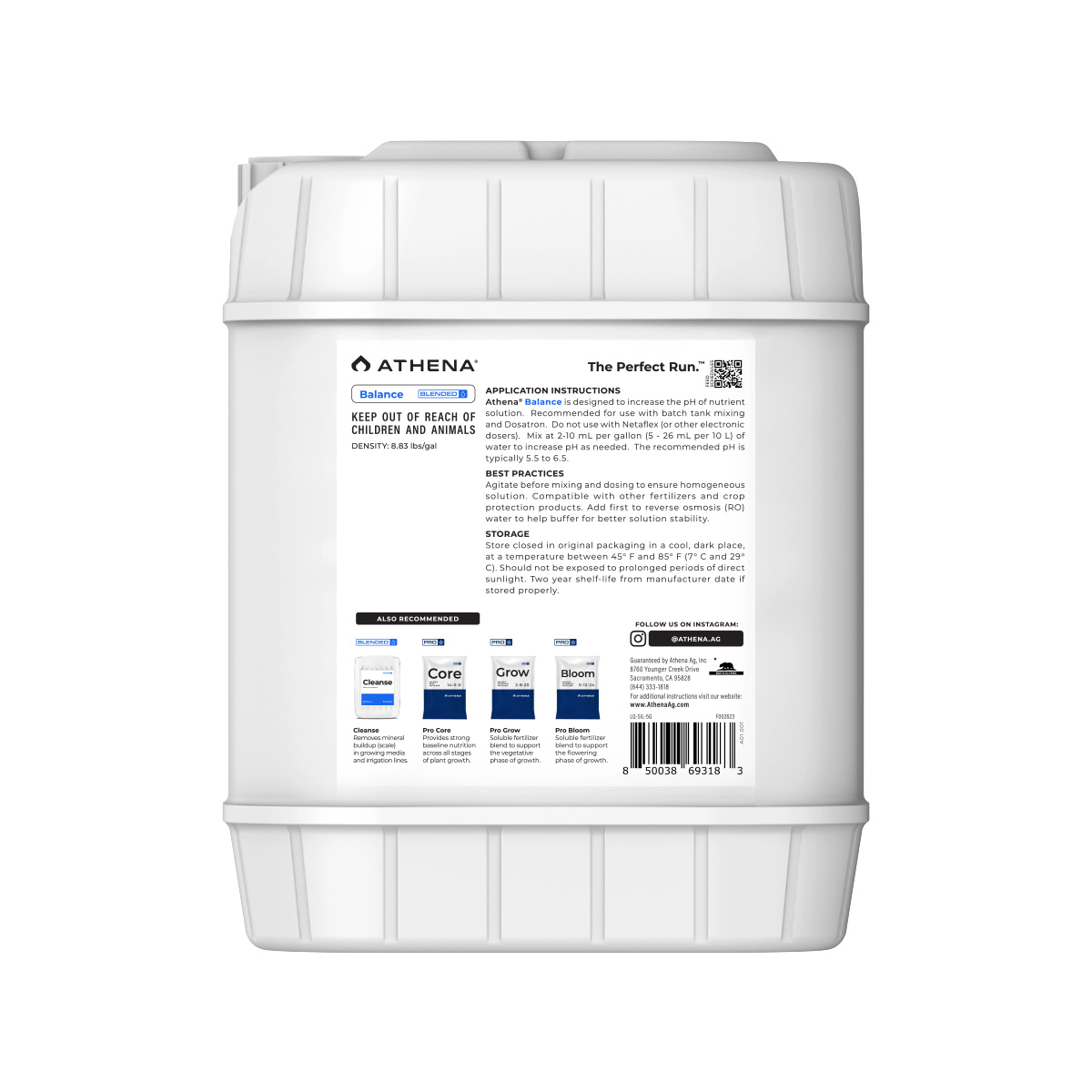 Athena Balance provides essential nutrients for crops in any stage of growth. It is also effective for adjusting pH up without harsh chemicals. Recommended for use with batch tank mixing and Dosatron. Do not use with Netaflex (or other electronic dosers).