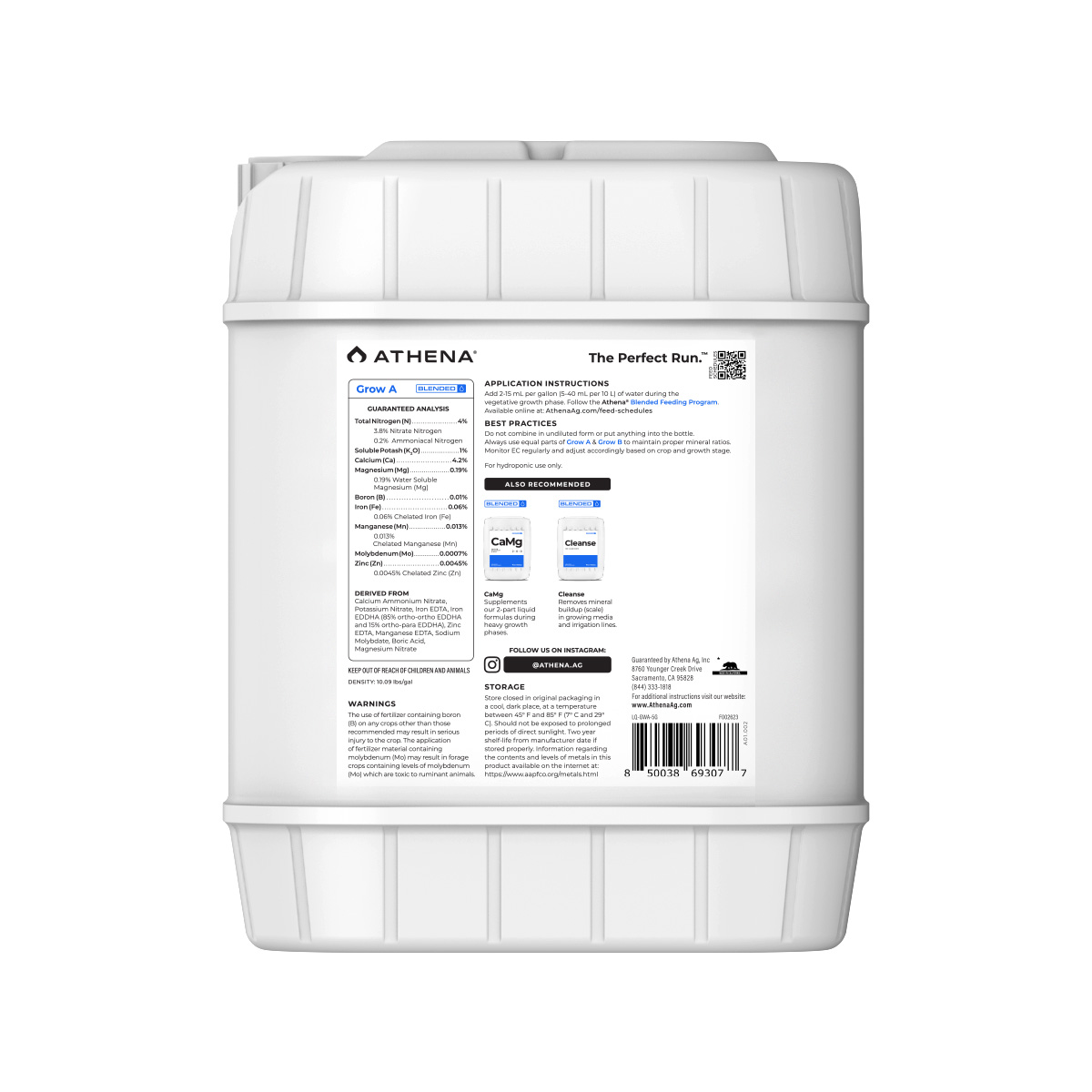 Athena Grow is a simple and clean formula designed for the vegetative stage of growth and for non-flowering plants. Our careful balanced mineral ratios help facilitate optimal plant development including photosynthesis, healthy respiration, and robust stalk and root growth.