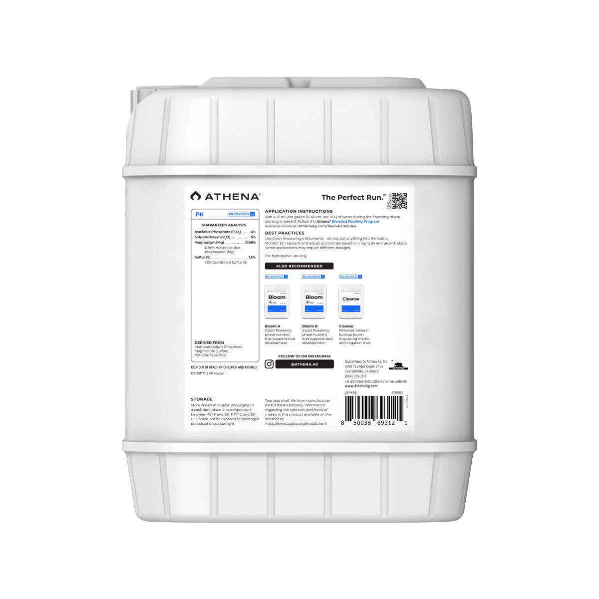 Athena PK is a balanced bloom boosting complement to our Bloom fertilizers. This clean liquid booster is designed to supplement during the mid- to late-flowering phase. Athena PK is a low Nitrogen booster that provides additional Phosphorus and Potassium that high-yielding plants require for maximal production. Many PK boosters add far too much of these elements and create a cascade of problems, such as reducing Calcium and Magnesium availability. Balanced elemental bioavailability is essential in the flowering phase to boost essential oil and terpene production.